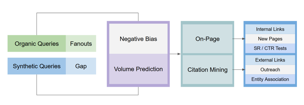 The Query Fanout system maps comprehensive topical landscapes around target keywords, generating hundreds to thousands of related queries across eight variation types. Volume prediction through the QDE model prioritizes high-value opportunities. Intent classification categorizes queries by buyer journey stage. The output: a complete blueprint for topical authority showing exactly which questions AI models might ask and which content gaps currently exist.
