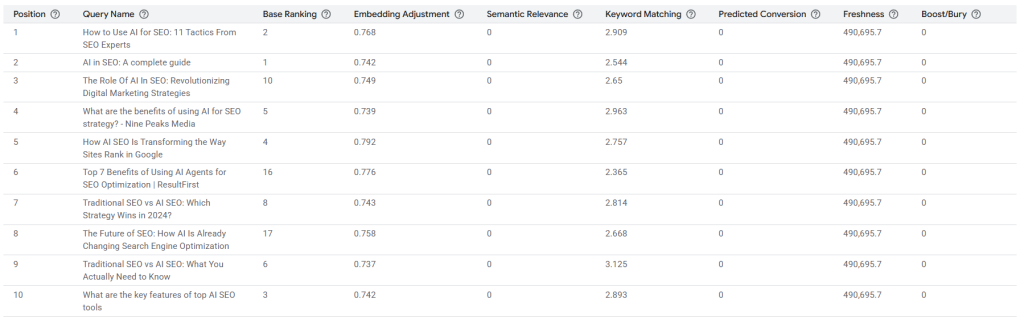 • Predicted Conversion – This score predicts the likelihood of a user engaging with the result (e.g., clicking), based on historical user interaction data (PCTR/PCVR).