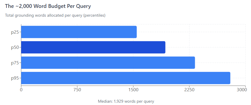 Each query has a fixed grounding budget of approximately 2,000 words total, distributed across sources by relevance rank.