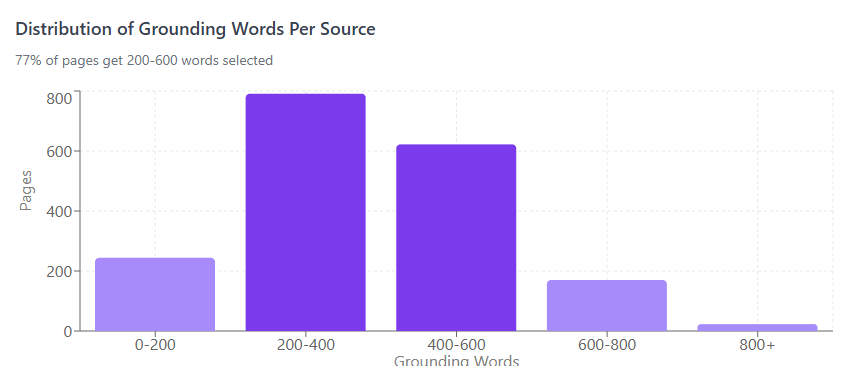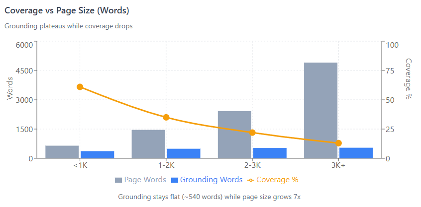 Grounding plateaus at ~540 words / ~3,500 characters. Pages over 2,000 words see diminishing returns—adding more content dilutes your coverage percentage without increasing what gets selected.