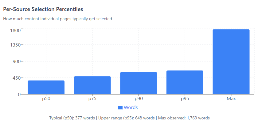 77% of pages get 200-600 words selected. The typical page gets ~377 words.